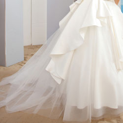 Свадебное платье бального кроя без бретелек из атласа и органзы.