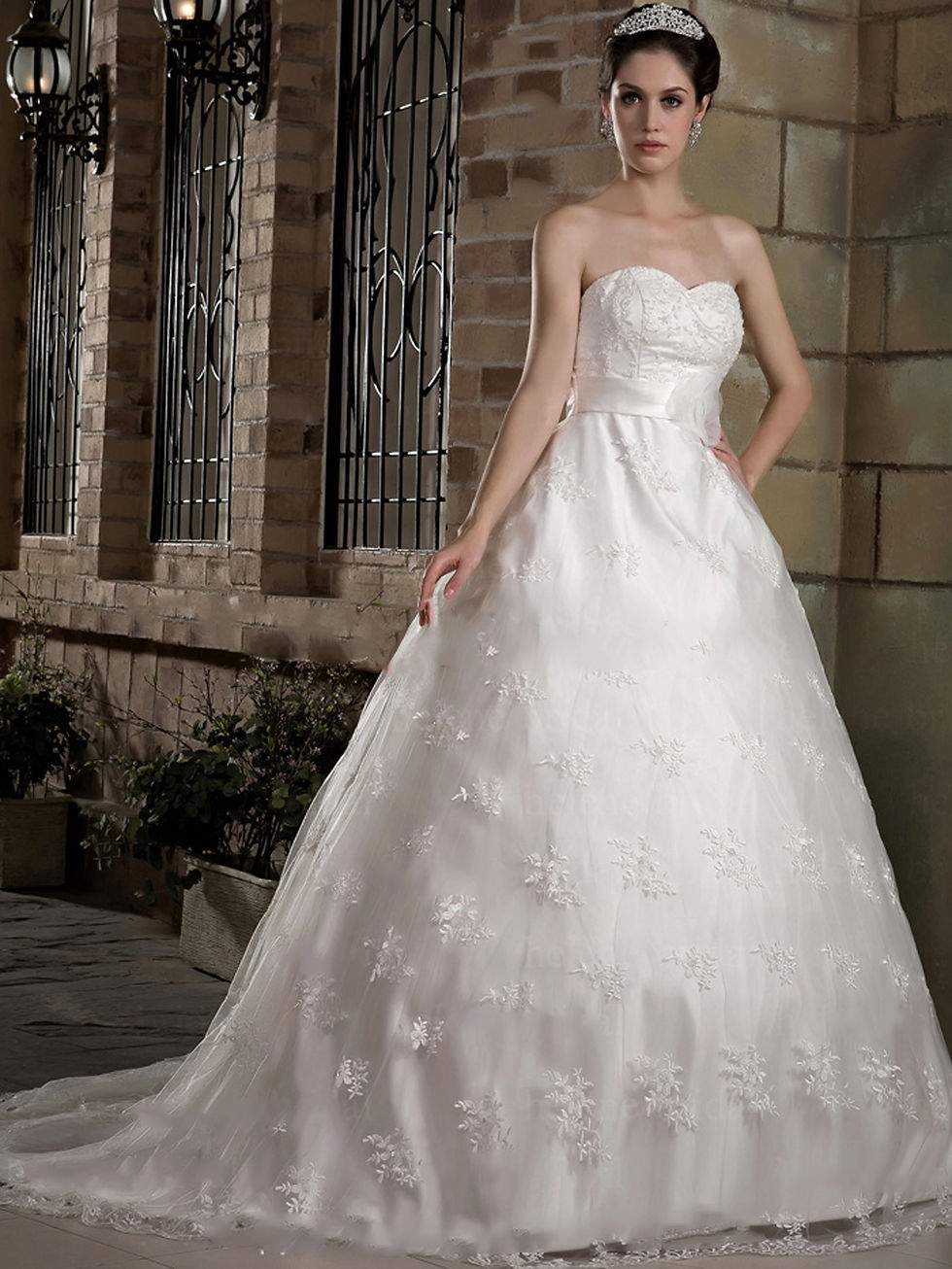 Свадебное платье бального кроя с вырезом в форме сердца из атласа и тюля