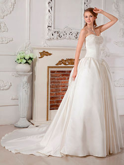 Свадебное платье бального кроя без бретелек из атласа и органзы.